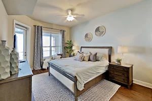Bedroom & Bathroom 1: The master bedroom features a large king bed, direct patio access, lake views, and a smart TV. Resort quality linens and towels are provided as well as plenty of closet space to go along with the modern dressers. The attached master bathroom features a double vanity sink, a walk-in shower, and a luxurious soaking tub to relax in after a long day out on the lake or golf course.